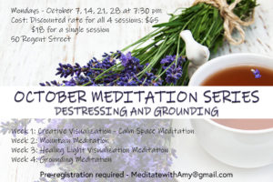 Join us for a four part series dedicated to de-stressing and grounding! This meditation series will also include lavender aromatherapy, candles and tea.